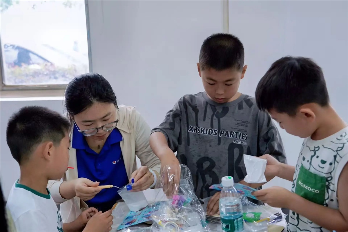 ▲在父母的陪伴與引導(dǎo)下,萌娃們用巧手將色彩斑斕的材料變?yōu)橐幻睹丢?dú)一無二的創(chuàng)意冰箱貼。
