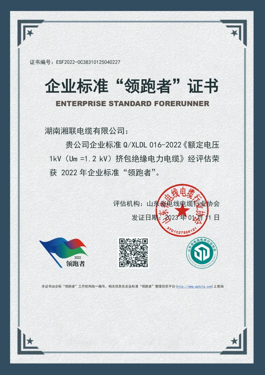 近日,湖南湘聯(lián)電纜有限公司企業(yè)標準Q/XLDL 010-2022《額定電壓 6kV(Um=7.2kV)到 35kV(Um=40.5kV)擠包石墨烯內(nèi)外屏蔽交聯(lián)聚乙烯絕緣電力電纜》、Q/XLDL 016-2022《額定電壓 1kV(Um =1.2 kV)擠包絕緣電力電纜》、Q/XLDL 017-2022《額定電壓450/750V及以下銅芯聚氯乙烯絕緣環(huán)保家裝布電線》三項產(chǎn)品經(jīng)評定機構(gòu)評估,榮獲2022年全國企業(yè)標準“領(lǐng)跑者”。
