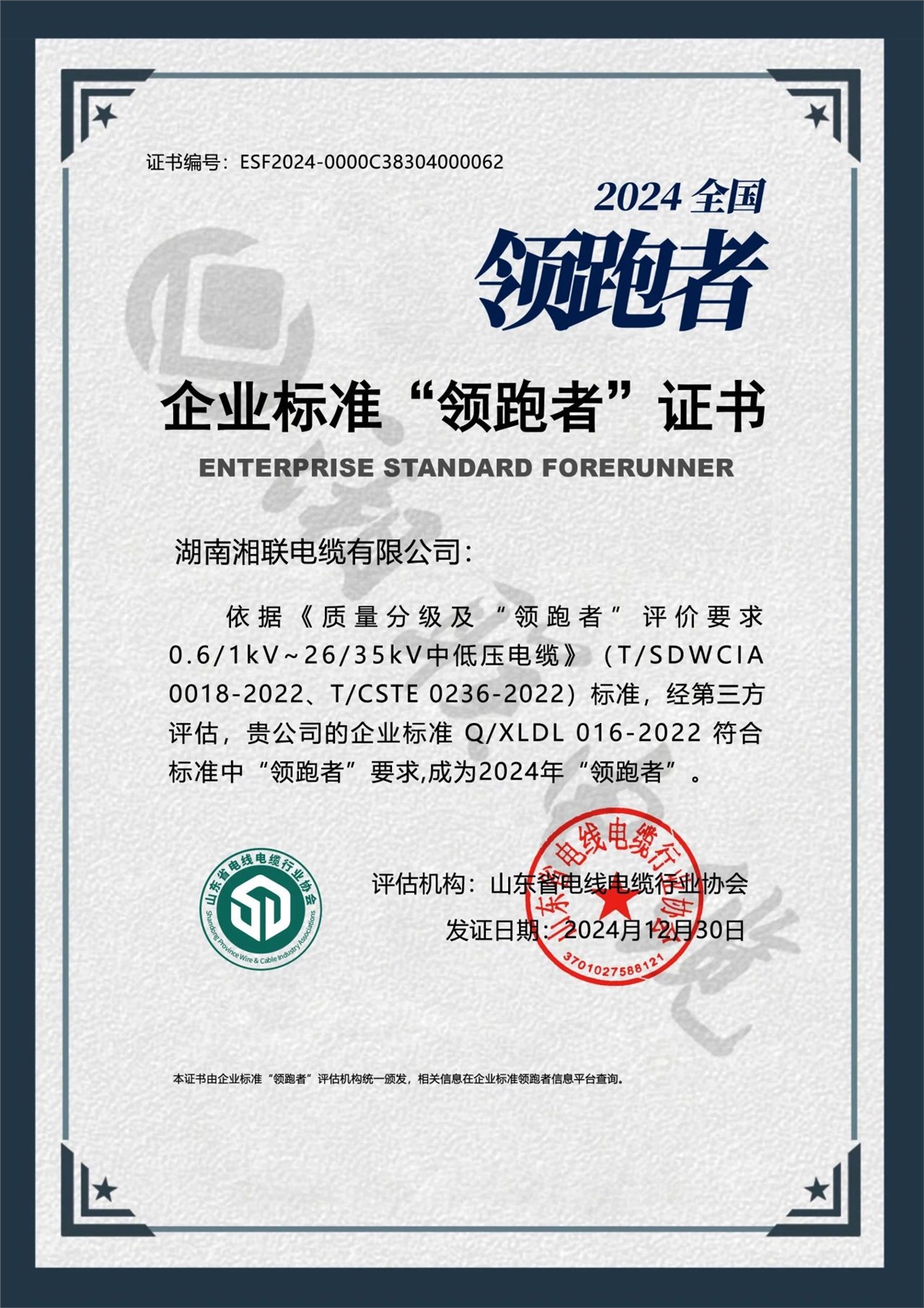 近日,2024年度企業標準“領跑者”名單發布,湘聯電纜Q/XLDL010-2022、Q/XLDL018-2023、Q/XLDL016-2022三項企業標準榮獲2024年企業標準領跑者,這也是湘聯電纜連續第三年獲此殊榮。